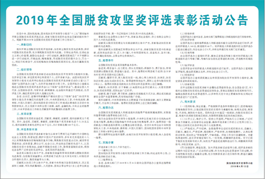 經(jīng)黨中央、國(guó)務(wù)院批準(zhǔn),國(guó)務(wù)院扶貧開發(fā)領(lǐng)導(dǎo)小組在“十三五”期間每年開展全國(guó)脫貧攻堅(jiān)獎(jiǎng)評(píng)選活動(dòng),表彰為脫貧攻堅(jiān)作出突出貢獻(xiàn)的組織和個(gè)人?,F(xiàn)就開展2019年全國(guó)脫貧攻堅(jiān)獎(jiǎng)評(píng)選表彰工作公告如下。