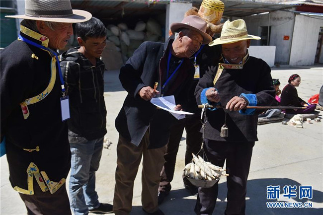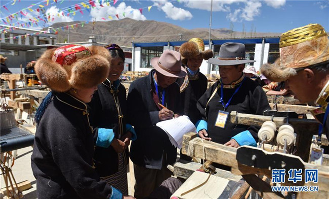 4月26日,氆氌制作技能比賽評委和工作人員正在評估選手捻線成績。