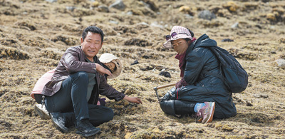 崔久鄉(xiāng)的拉姆(右一)等牧民,在剛?cè)谘┎痪玫纳狡虏莸厣蠈ふ蚁x草。