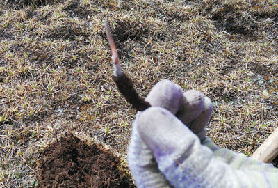 發(fā)現(xiàn)蟲草后,拉姆用鋤頭小心地翻起一塊草皮,拔出了一根蟲草。