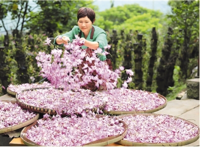 近日,貴州省赤水市的金釵石斛花陸續(xù)進(jìn)入盛花期。據(jù)了解,金釵石斛是一種名貴中藥材,有“仙草”之稱。近年來,赤水市多個(gè)鄉(xiāng)鎮(zhèn)積極推進(jìn)農(nóng)業(yè)與鄉(xiāng)村旅游等產(chǎn)業(yè)融合,采取“合作社+支部+農(nóng)戶”模式,鼓勵(lì)農(nóng)民種植金釵石斛,助力脫貧攻堅(jiān)和鄉(xiāng)村振興。圖為一名當(dāng)?shù)剞r(nóng)婦在晾曬剛采摘的金釵石斛鮮花。王長育攝(新華社發(fā))
