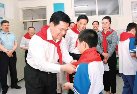 李紀(jì)恒來到一年級二班,“愛祖國、擔(dān)大任,爭做新時代好隊員”主題隊日活動正在舉行,一名少先隊員走上前來,為他戴上鮮艷的紅領(lǐng)巾。李紀(jì)恒說,看到小朋友們快樂活潑、朝氣蓬勃,我很高興,“六一”國際兒童節(jié)快到了,我提前祝大家和全區(qū)的小朋友們節(jié)日快樂、學(xué)習(xí)進(jìn)步、健康成長。