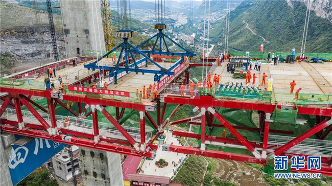 正在拼裝最后一片鋼桁梁的赤水河大橋(5月30日無人機(jī)拍攝)。新華社記者 陶亮 攝