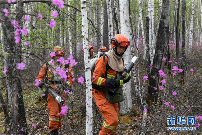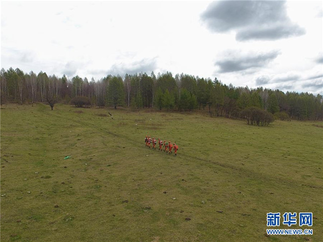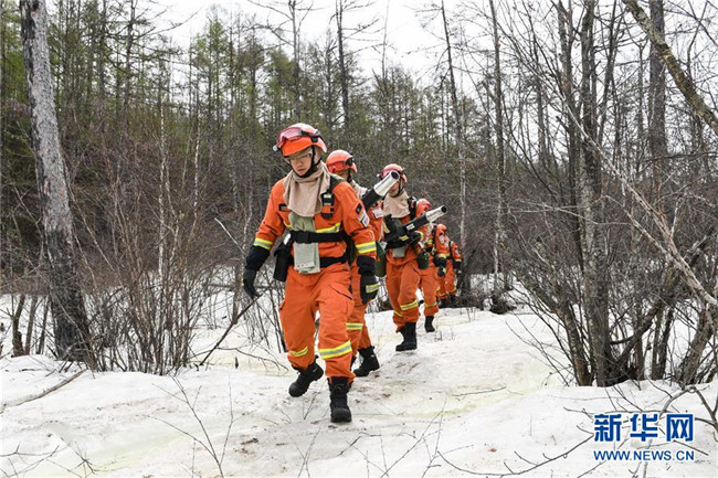 奇乾中隊消防隊員在戶外進行綜合訓練時經過一片暫未消融的冰雪(5月19日攝)。新華社記者 劉磊 攝