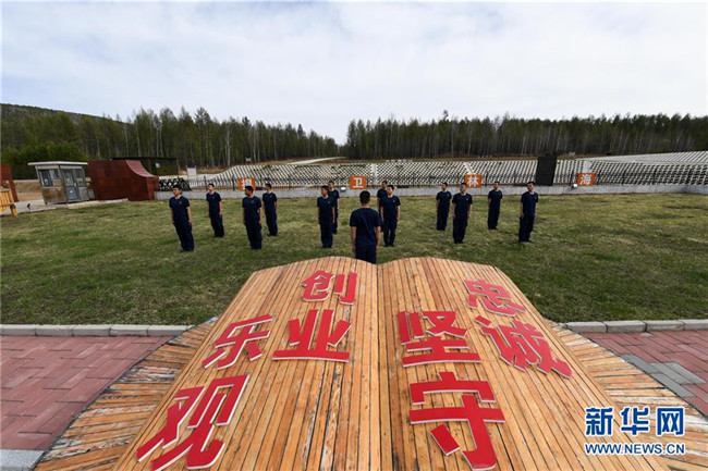 這是內蒙古森林消防總隊大興安嶺支隊奇乾中隊的營地,營地后山上的“忠誠”二字是用白樺樹樹干拼接而成(5月15日攝)。新華社記者 劉磊 攝