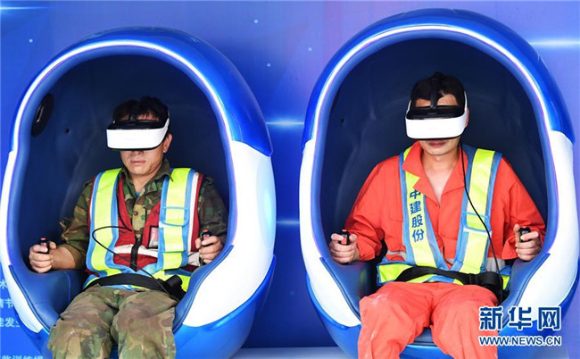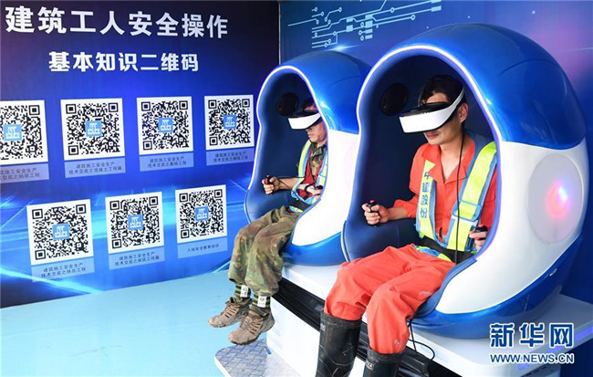 6月5日,重慶化龍橋超高層項目工人在VR安全體驗館內(nèi)體驗“高空墜落”。在VR安全體驗館,工人們通過VR游戲的方式了解施工過程中可能遇到的危險、困難以及解決方法。 新華社記者 王全超 攝
