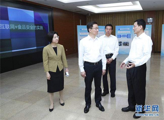6月13日,在2019年全國食品安全宣傳周活動前夕,中共中央政治局常委、國務院副總理、國務院食品安全委員會主任韓正到國務院食品安全委員會辦公室主持召開座談會,聽取對食品安全工作的意見建議。這是會前,韓正參觀食品安全工作情況展示,考察了解食品安全智慧監(jiān)管的創(chuàng)新舉措。新華社記者龐興雷攝