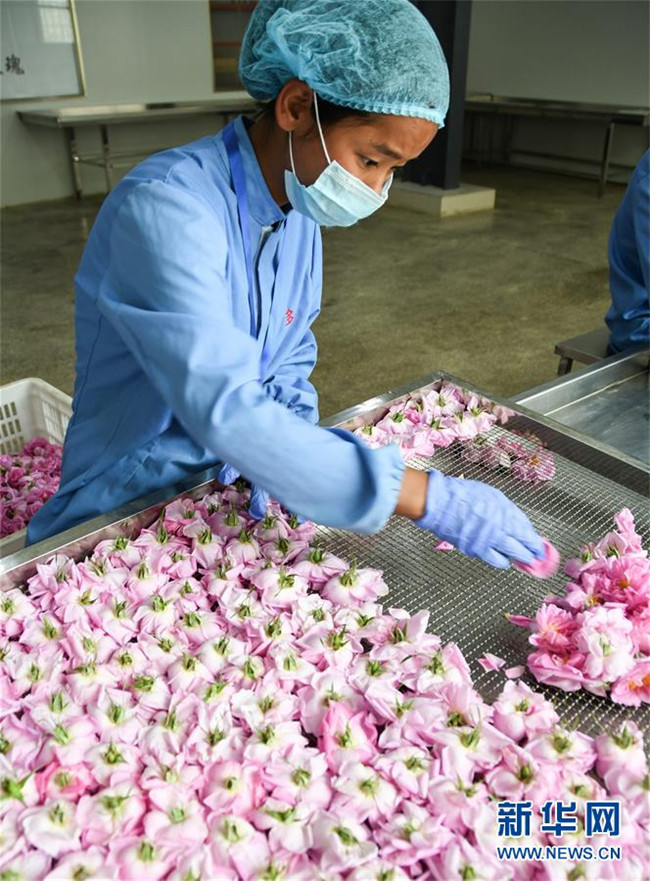 6月26日,在四川省小金縣清多香玫瑰種植專業(yè)合作社,工人在選花。 新華社記者 高健鈞 攝