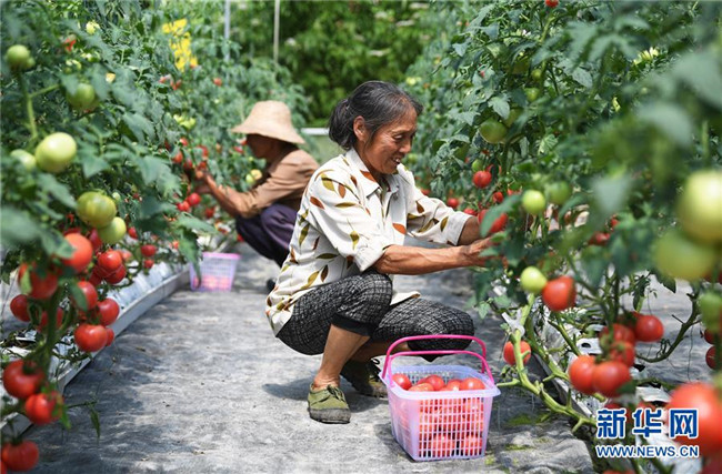 7月2日,馬灌鎮(zhèn)果園村村民在無土栽培西紅柿大棚內(nèi)采摘。新華社記者 王全超 攝