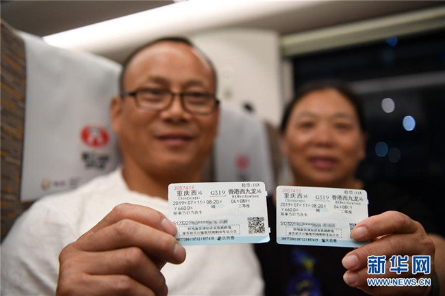 7月11日,乘坐G319次列車(chē)的乘客展示前往香港的車(chē)票。當(dāng)日,重慶至香港直達(dá)高鐵正式開(kāi)通,此次首發(fā)的G319次復(fù)興號(hào)列車(chē)運(yùn)行速度350km/h,沿途經(jīng)停遵義、貴陽(yáng)東、桂林西、肇慶東、廣州南和深圳北站。列車(chē)由重慶西站至香港西九龍站全程運(yùn)行需7小時(shí)37分鐘,全程票二等座票價(jià)為660元。目前內(nèi)地與香港聯(lián)通的高鐵車(chē)站已增加到58個(gè)。新華社記者唐奕攝