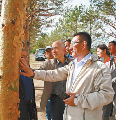 于海?。ㄇ埃┡c苗木專家在察看林場(chǎng)樹木。新華社發(fā)