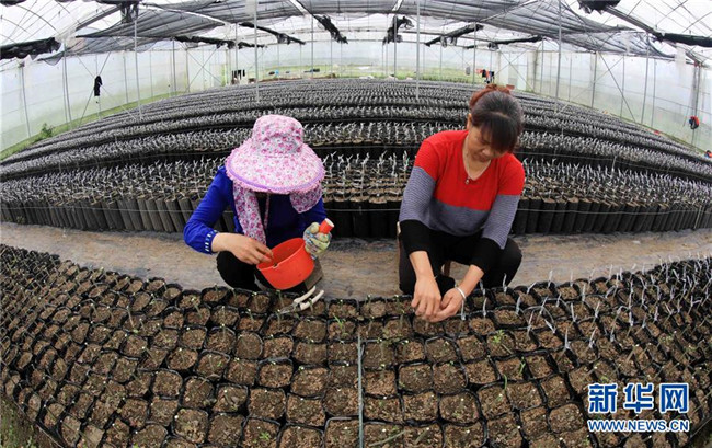 在廣西融安縣大良鎮(zhèn)古蘭村古蘭屯大棚基地,村民在嫁接金桔苗(4月12日攝)。新華社記者 黃孝邦 攝