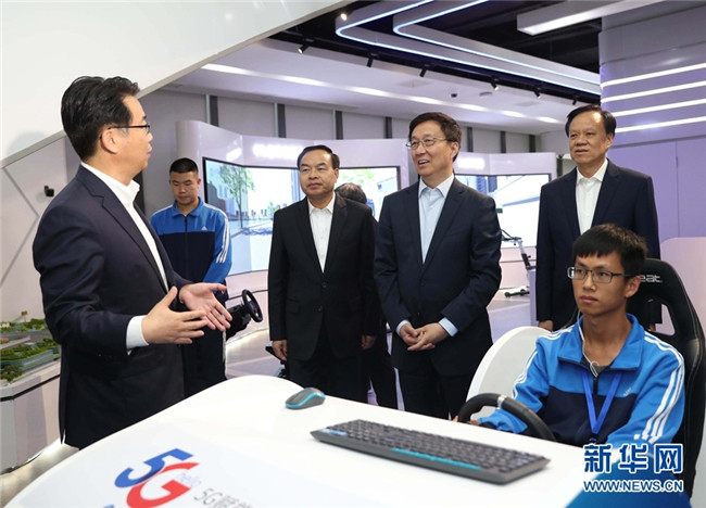 10月14日至15日,中共中央政治局常委、國(guó)務(wù)院副總理韓正在重慶市調(diào)研。這是10月15日,韓正來到禮嘉智慧公園,了解園區(qū)開發(fā)建設(shè)情況,體驗(yàn)智能機(jī)器人和5G技術(shù)在遠(yuǎn)程駕駛、教育、旅游等方面的應(yīng)用。 新華社記者 劉衛(wèi)兵 攝