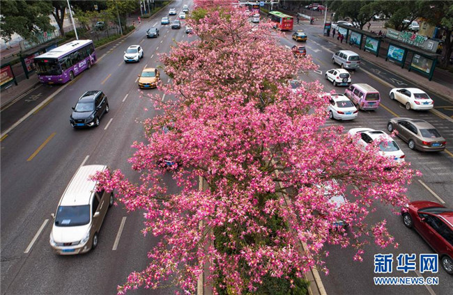 這是美麗異木棉花競(jìng)相綻放的廣西柳州市東環(huán)大道(12月1日無(wú)人機(jī)拍攝)。新華社記者 黃孝邦 攝