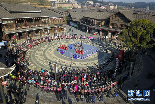 當日,貴州省黔東南苗族侗族自治州丹寨縣迎來苗族傳統(tǒng)節(jié)日“祭尤節(jié)”,近千名身著節(jié)日盛裝的苗族群眾與游客齊聚丹寨萬達小鎮(zhèn),歡度傳統(tǒng)佳節(jié)。