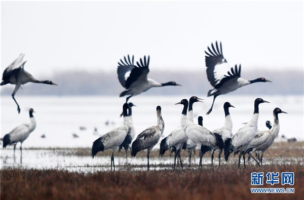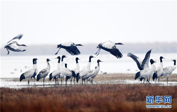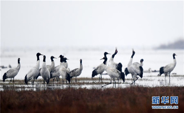 12月11日在貴州草海保護(hù)區(qū)拍攝的黑頸鶴。新華社記者楊文斌攝