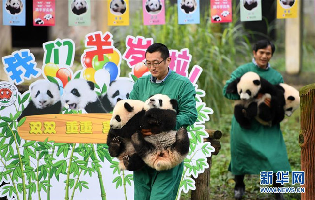 12月22日,重慶動(dòng)物園4只半歲大熊貓?jiān)谕嫠?。?dāng)日,重慶動(dòng)物園為4只大熊貓寶寶“雙雙”“重重”“喜喜”“慶慶”舉行半歲生日慶?;顒?dòng)。4只半歲大熊貓?jiān)陲曫B(yǎng)員的照料下,在熊貓館運(yùn)動(dòng)場內(nèi)玩耍、嬉戲,與市民游客一同過冬至。新華社記者唐奕攝