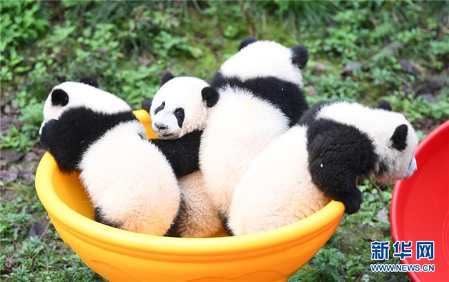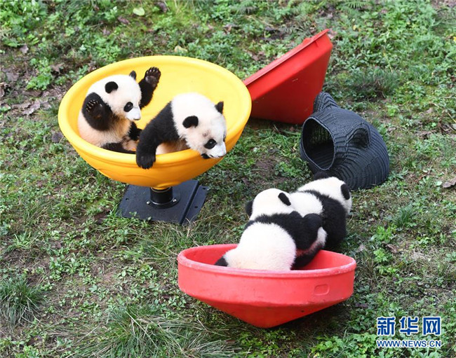 12月22日,重慶動(dòng)物園4只半歲大熊貓?jiān)趹敉饣顒?dòng)。當(dāng)日,重慶動(dòng)物園為4只大熊貓寶寶“雙雙”“重重”“喜喜”“慶慶”舉行半歲生日慶?;顒?dòng)。4只半歲大熊貓?jiān)陲曫B(yǎng)員的照料下,在熊貓館運(yùn)動(dòng)場內(nèi)玩耍、嬉戲,與市民游客一同過冬至。新華社記者唐奕攝