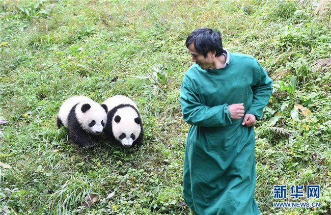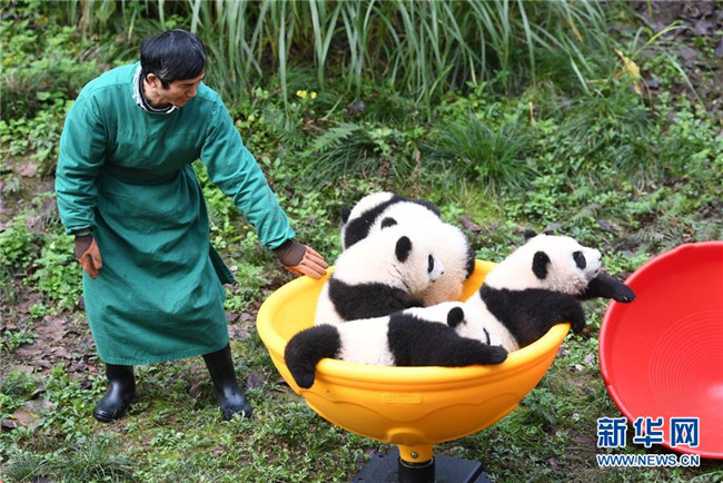 12月22日,飼養(yǎng)員引導(dǎo)大熊貓寶寶到戶外運(yùn)動(dòng)。當(dāng)日,重慶動(dòng)物園為4只大熊貓寶寶“雙雙”“重重”“喜喜”“慶慶”舉行半歲生日慶?;顒?dòng)。4只半歲大熊貓?jiān)陲曫B(yǎng)員的照料下,在熊貓館運(yùn)動(dòng)場內(nèi)玩耍、嬉戲,與市民游客一同過冬至。新華社記者唐奕攝