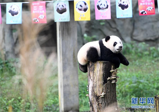 12月22日,重慶動(dòng)物園1只半歲的大熊貓?jiān)趹敉饣顒?dòng)。當(dāng)日,重慶動(dòng)物園為4只大熊貓寶寶“雙雙”“重重”“喜喜”“慶慶”舉行半歲生日慶?;顒?dòng)。4只半歲大熊貓?jiān)陲曫B(yǎng)員的照料下,在熊貓館運(yùn)動(dòng)場內(nèi)玩耍、嬉戲,與市民游客一同過冬至。新華社記者唐奕攝