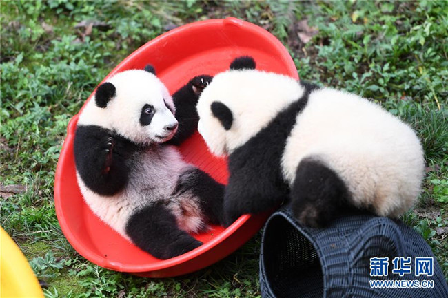 12月22日,重慶動(dòng)物園兩只半歲大熊貓?jiān)谕嫠?。?dāng)日,重慶動(dòng)物園為4只大熊貓寶寶“雙雙”“重重”“喜喜”“慶慶”舉行半歲生日慶?;顒?dòng)。4只半歲大熊貓?jiān)陲曫B(yǎng)員的照料下,在熊貓館運(yùn)動(dòng)場內(nèi)玩耍、嬉戲,與市民游客一同過冬至。新華社記者唐奕攝