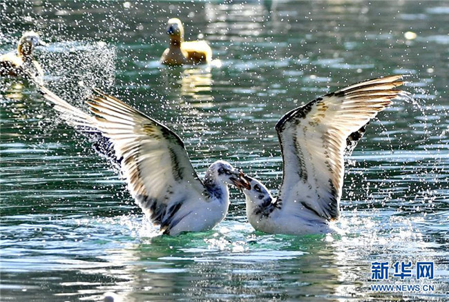 兩只紅嘴鷗在龍王潭公園的水面上爭食(12月20日攝)。新華社記者 張汝鋒 攝