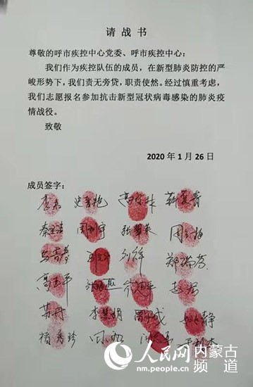 1月26日,1000封按滿紅手印的請戰(zhàn)書“刷屏”了。“在全國上下齊心協(xié)力共同抗擊新型冠狀病毒感染的肺炎疫情之際,請各位主任統(tǒng)計匯總本科室主動申請隨時去抗疫前線的醫(yī)師,并將自愿報名的名單發(fā)至本群。”呼和浩特市第一醫(yī)院普外科主任醫(yī)師烏云塔娜把“請戰(zhàn)”信息發(fā)到微信群后,手機(jī)就一直響個不停。不到一天,呼和浩特市第一醫(yī)院主動“請戰(zhàn)”的醫(yī)護(hù)人員就達(dá)到200多人。