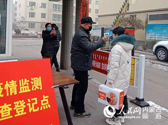 社區(qū)工作人員對出入小區(qū)的居民進(jìn)行登記并測量體溫。呼和浩特市富麗社區(qū)供圖