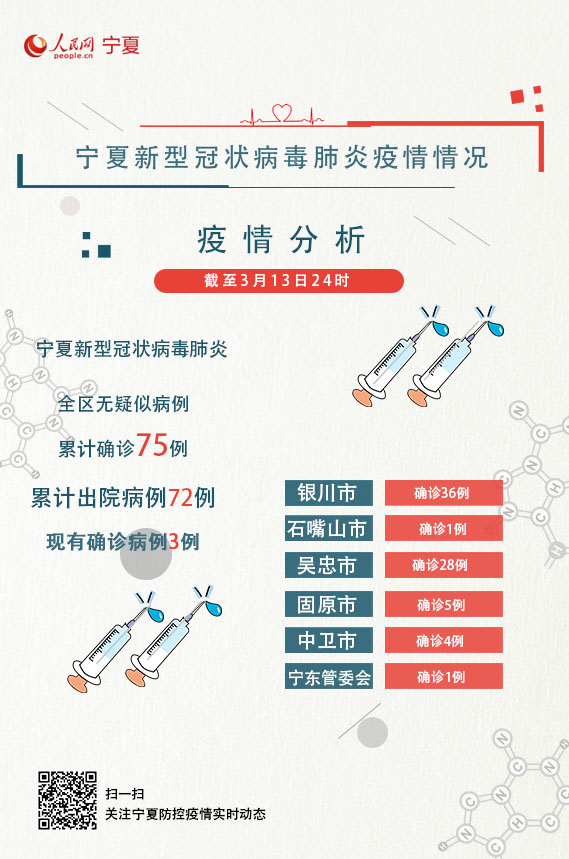 截至3月13日24時,全區(qū)現(xiàn)有確診病例3例,累計出院病例72例。全區(qū)累計報告確診病例75例,其中銀川市36例,石嘴山市1例,吳忠市28例,固原市5例,中衛(wèi)市4例,寧東1例。全區(qū)無疑似病例。
