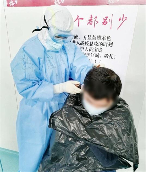 1艙有康復人員想理發(fā),手頭沒有工具,朱晴護士長得知后,聯(lián)系下個班次護士帶來推子,給大家理發(fā)。“看你動作很嫻熟啊,以前練過的吧”,“圍觀群眾”打趣道。“現(xiàn)學現(xiàn)賣,大家要求不要太高,有壓力??!”朱晴說。一直推到推子沒電,朱晴給6位康復人員簡單修剪了頭發(fā)。得知朱晴是西安醫(yī)療隊的護士,大家都親切的稱她“肉夾饃”!