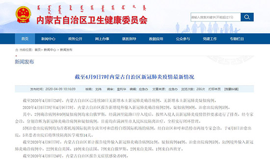 2020年4月8日7時至4月9日7時,內(nèi)蒙古自治區(qū)報告新增境外輸入新冠肺炎確診病例2例、疑似病例9例、治愈出院病例5例。