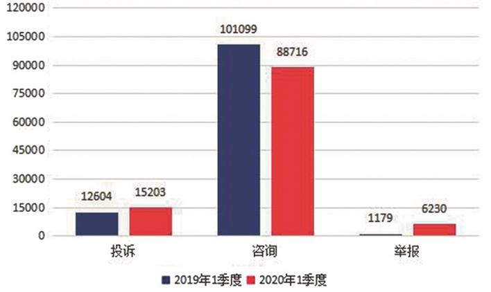 一季度,全省共受理消費者投訴15203件,與2019年同期相比上升了20.6%。其中商品類投訴7635件,與2019年同期相比上升了39.3%,服務(wù)類投訴7568件,與2019年同期相比上升了6.3%。