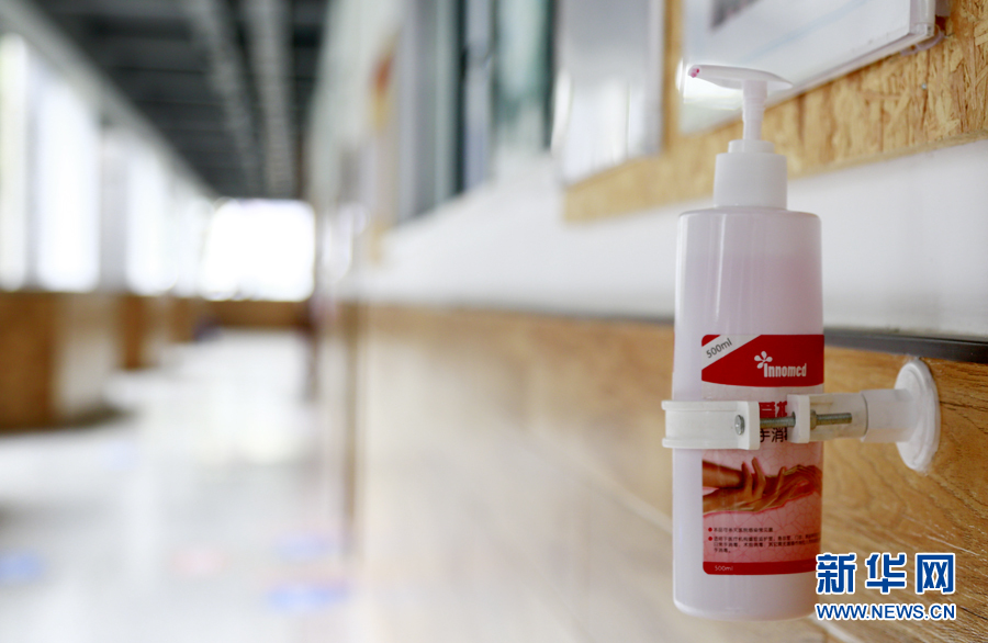在教室、走廊、寢室等人流密集的場合,重慶市第十一中學(xué)配備了免洗消毒液供師生使用。新華網(wǎng) 彭博攝