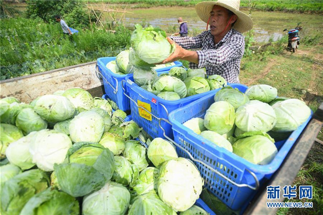 6月4日,在湘潭市雨湖區(qū)鶴嶺鎮(zhèn)龍安村,湘潭市仙女蔬菜產(chǎn)銷(xiāo)專(zhuān)業(yè)合作社的農(nóng)戶(hù)在田里采摘包菜。 新華社記者 陳澤國(guó) 攝