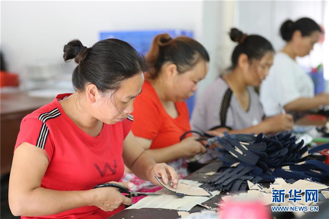 7月18日,在貴州省銅仁市玉屏侗族自治縣田坪鎮(zhèn)侗鄉(xiāng)風情園內,易地扶貧搬遷群眾在制鞋。新華社發(fā)(胡攀學 攝)