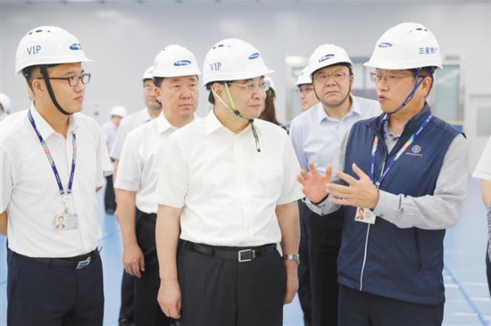 7月21日,省委書記胡和平到部分外資企業(yè)調(diào)研并召開座談會(huì)。圖為他在三星(中國)半導(dǎo)體公司閃存芯片二期項(xiàng)目現(xiàn)場(chǎng)聽取項(xiàng)目規(guī)劃介紹。 本報(bào)記者 張辰攝