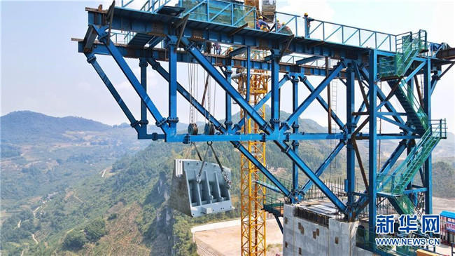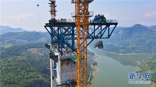 9月1日,工作人員在對主索鞍進行吊裝。新華社記者劉續(xù)攝