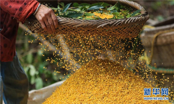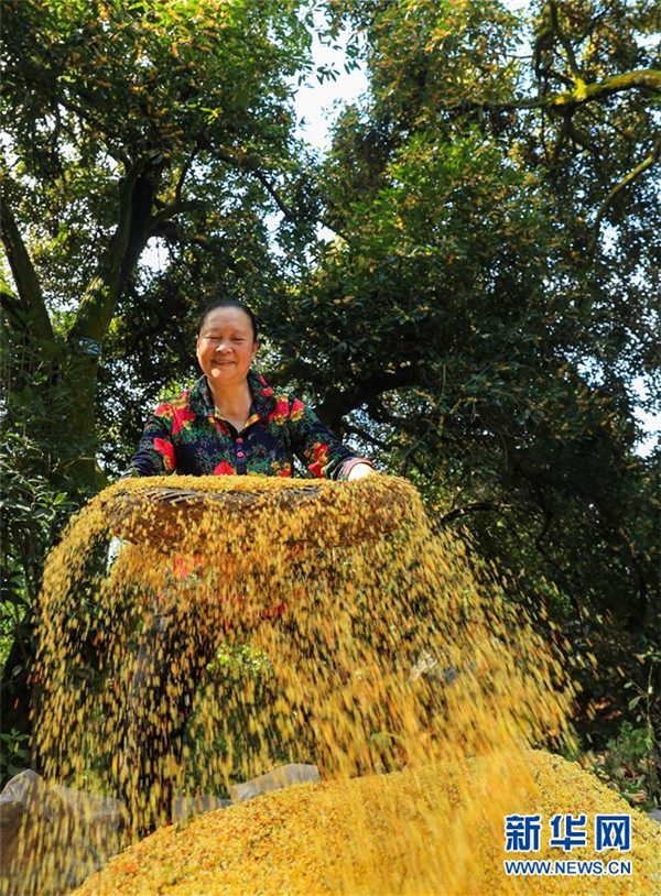 9月24日,四川省瀘州市江陽區(qū)鄰玉街道天堂村的村民在打收桂花。金秋時節(jié),四川省瀘州市江陽區(qū)鄰玉街道天堂村的村民們忙著打收桂花,制作桂花糕等美食,迎接中秋佳節(jié)的到來。新華社發(fā)(劉學(xué)懿攝)