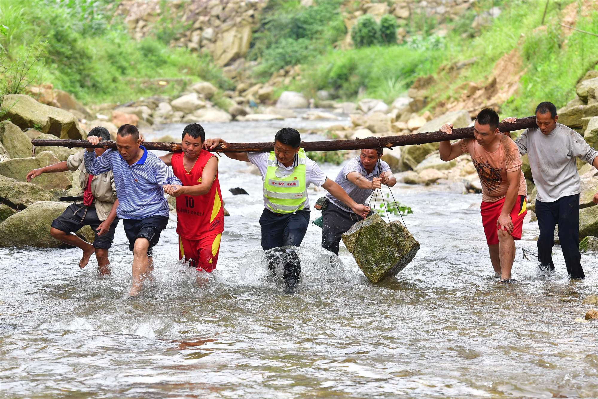在位于黔桂交界大苗山深處的烏英苗寨,駐村第一書記韋桂華(右四)、黨員梁成兵(右三)、梁志新(左二)帶領(lǐng)村民維修河堤(2019年6月30日攝)。新華社記者 黃孝邦 攝