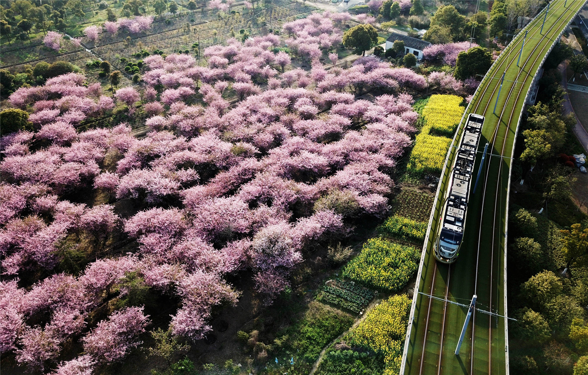 在江蘇蘇州高新區(qū),一輛有軌電車從一片盛開的垂絲海棠旁駛過(2018年3月28日攝)。新華社發(fā)(徐志強(qiáng) 攝)