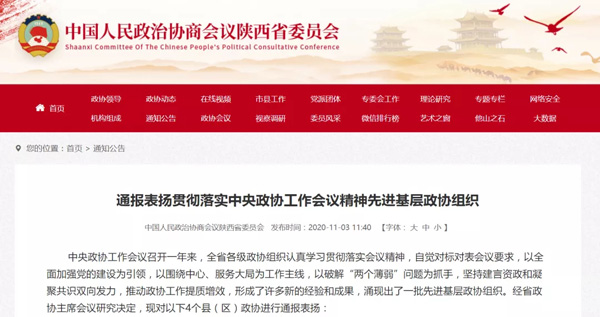 中央政協(xié)工作會議召開一年多來,陜西全省各級政協(xié)組織認(rèn)真貫徹落實會議精神,堅持建言資政和凝聚共識雙向發(fā)力,推動政協(xié)工作提質(zhì)增效,形成了許多新的經(jīng)驗和成果,涌現(xiàn)出了一批先進(jìn)基層政協(xié)組織。2020年11月2日,省政協(xié)十二屆四十七次主席會議決定通報表揚貫徹落實中央政協(xié)工作會議精神先進(jìn)基層政協(xié)組織,金臺區(qū)政協(xié)、富平縣政協(xié)、富縣政協(xié)和柞水縣政協(xié)4家縣(區(qū))政協(xié)組織榜上有名。