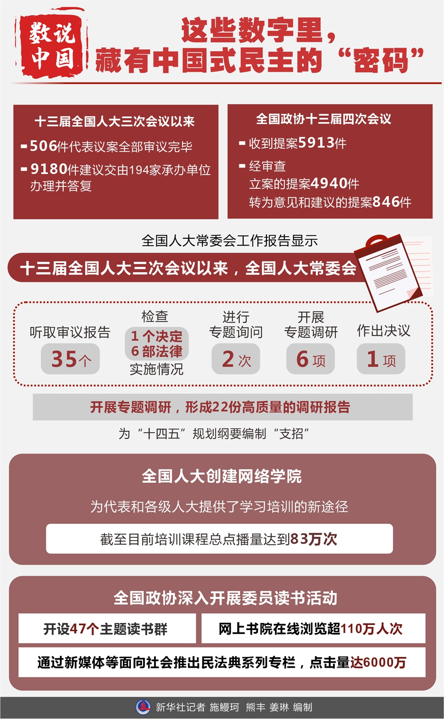 數(shù)字,蘊(yùn)藏中國式民主的“密碼”。透過全國人大常委會工作報告、全國政協(xié)常委會工作報告和提案工作情況報告,讓我們從幾組關(guān)鍵數(shù)據(jù)進(jìn)行“解碼”。