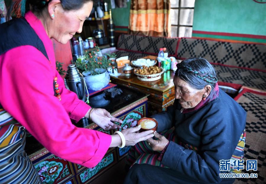 女兒給巴桑獻酥油茶(2月27日攝)。新華社記者 孫非 攝