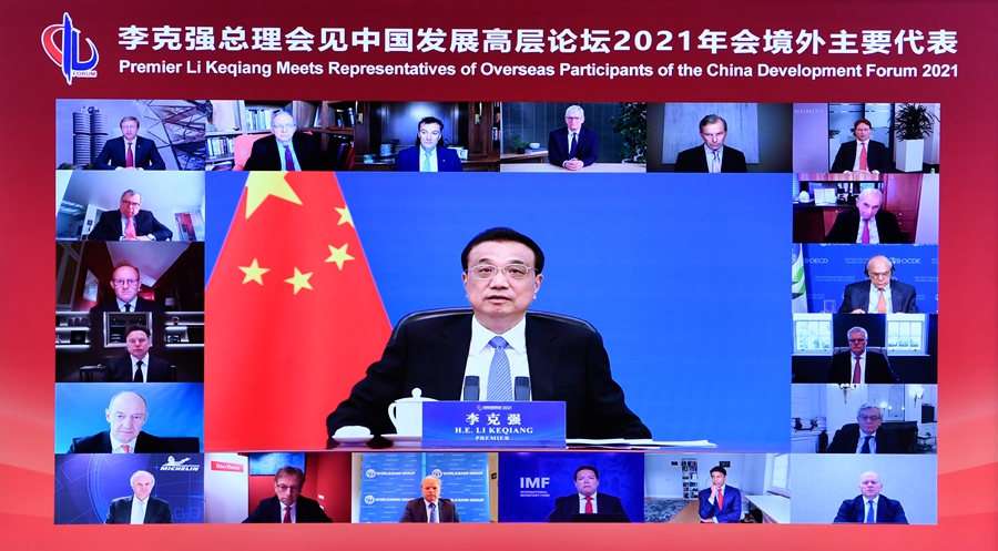 3月22日,國務(wù)院總理李克強在北京人民大會堂以視頻方式會見出席中國發(fā)展高層論壇2021年年會的境外代表。新華社記者 申宏 攝