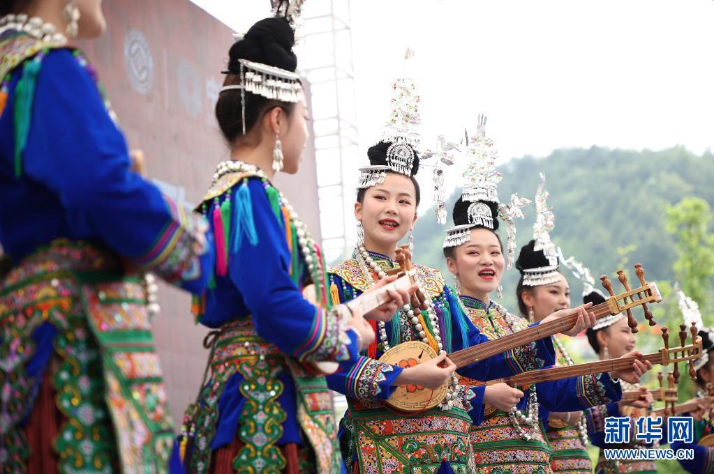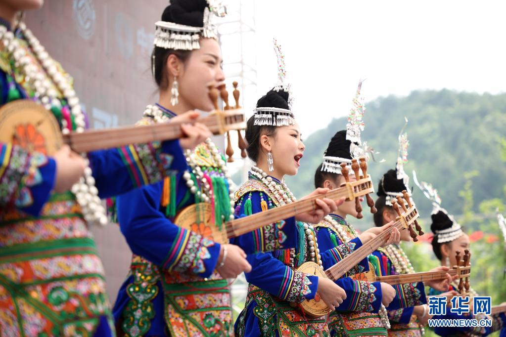 5月16日,演員在丹寨縣萬(wàn)達(dá)小鎮(zhèn)非遺歌舞展演活動(dòng)上表演侗族琵琶歌。