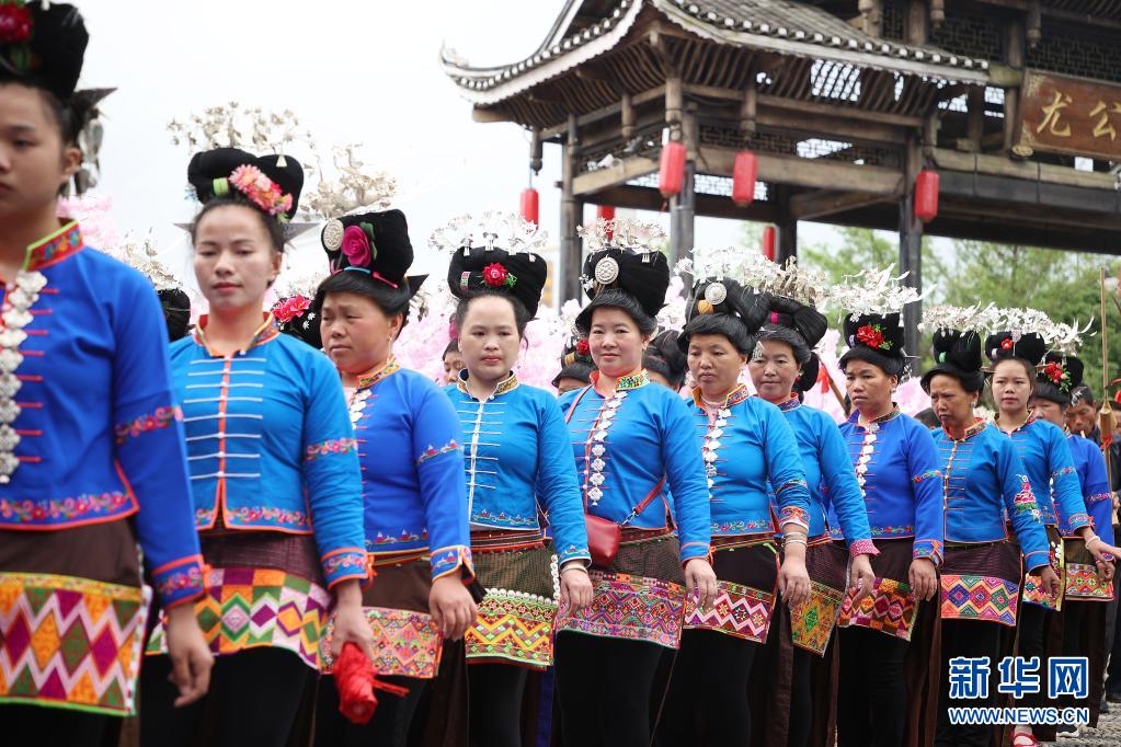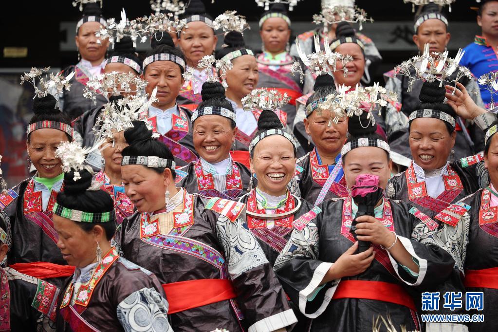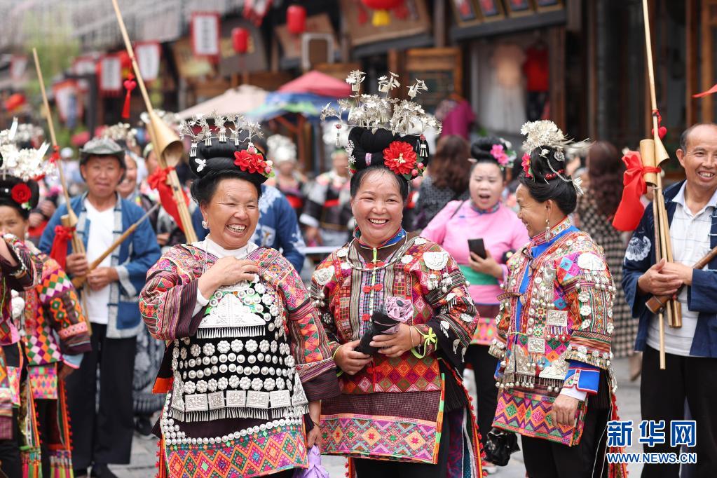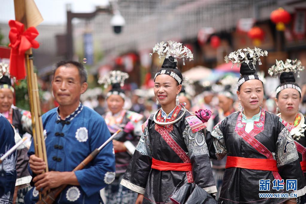 當(dāng)日,貴州省黔東南苗族侗族自治州丹寨縣萬(wàn)達(dá)小鎮(zhèn)在“第二屆中國(guó)丹寨非遺周”中舉辦苗族盛裝巡游、非遺歌舞展演活動(dòng)。