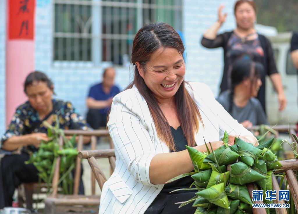 6月2日,貴州省銅仁市玉屏侗族自治縣亞魚鄉(xiāng)郭家灣村村民參加包粽子比賽。新華社發(fā)(胡攀學(xué)攝)