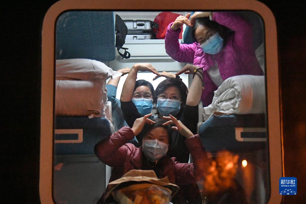 10月29日,滯留游客離開額濟(jì)納旗時,在列車車廂里擺出一個個“愛心”。新華社發(fā)(王磊 攝)
