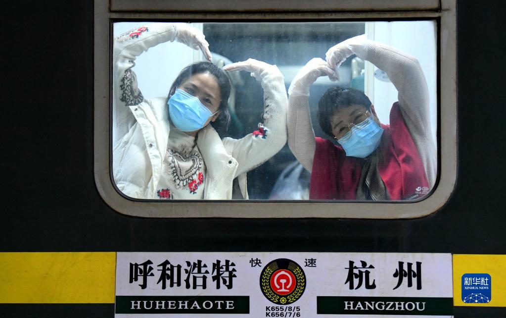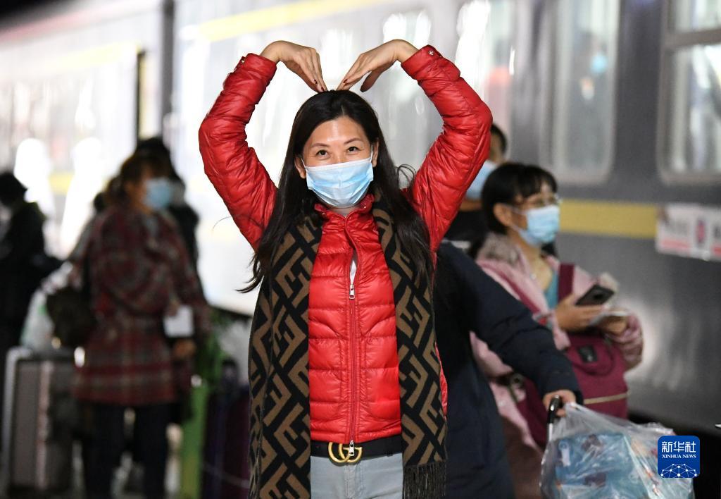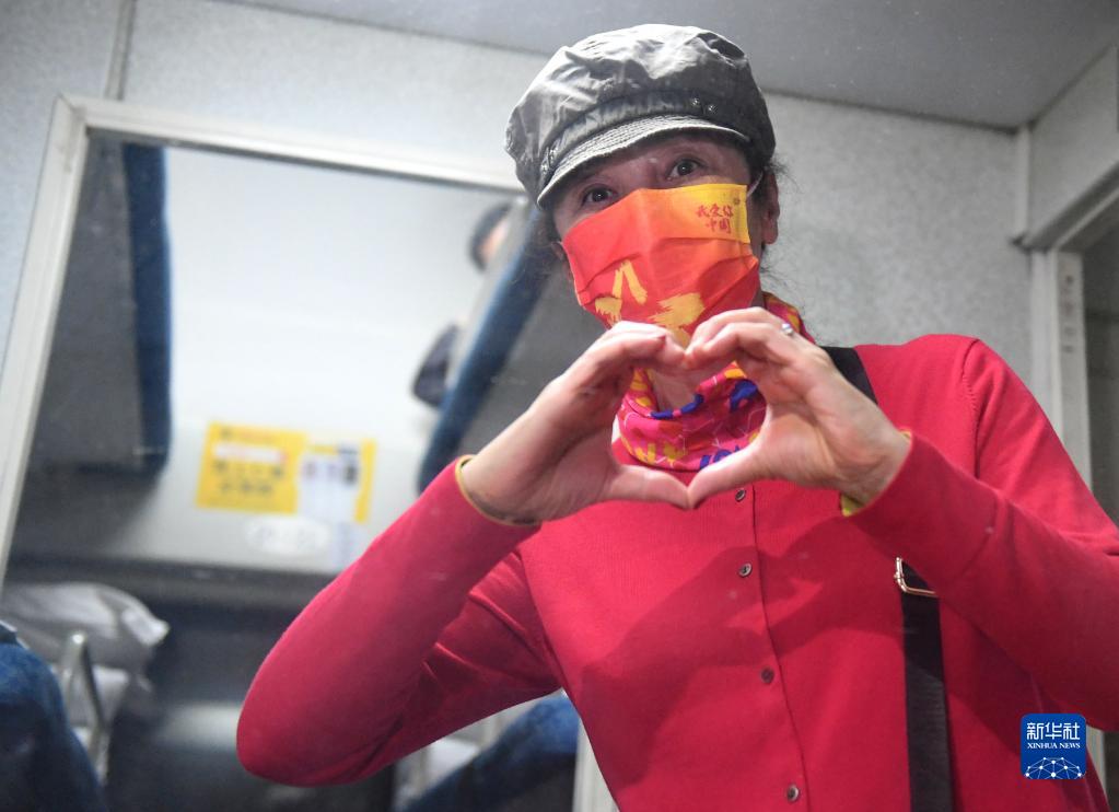 10月29日,一名滯留游客離開額濟(jì)納旗時,在列車車廂里用雙手比劃出“愛心”。新華社發(fā)(王磊 攝)