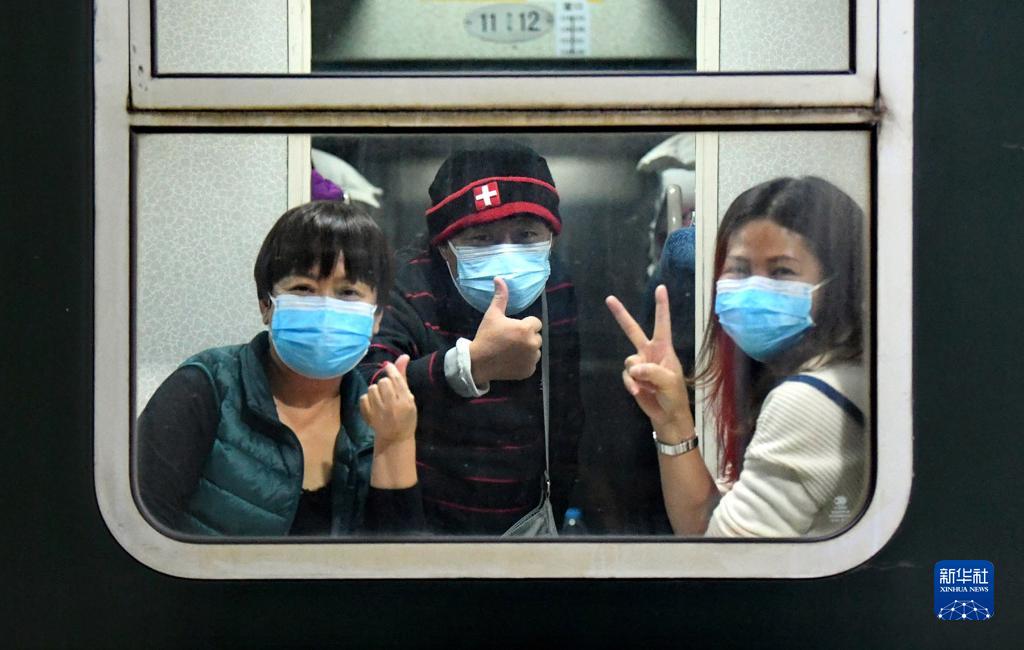 10月29日,滯留游客離開額濟(jì)納旗時,在列車車廂里與地面人員告別。新華社發(fā)(王磊 攝)